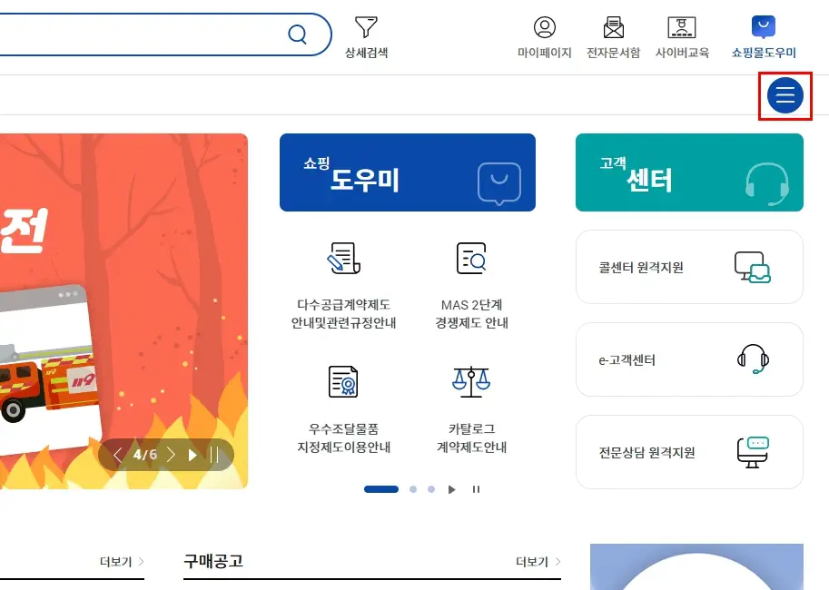 1. 종합쇼핑몰에 로그인 후 우측 상단의 햄버거 메뉴 아이콘을 클릭합니다.