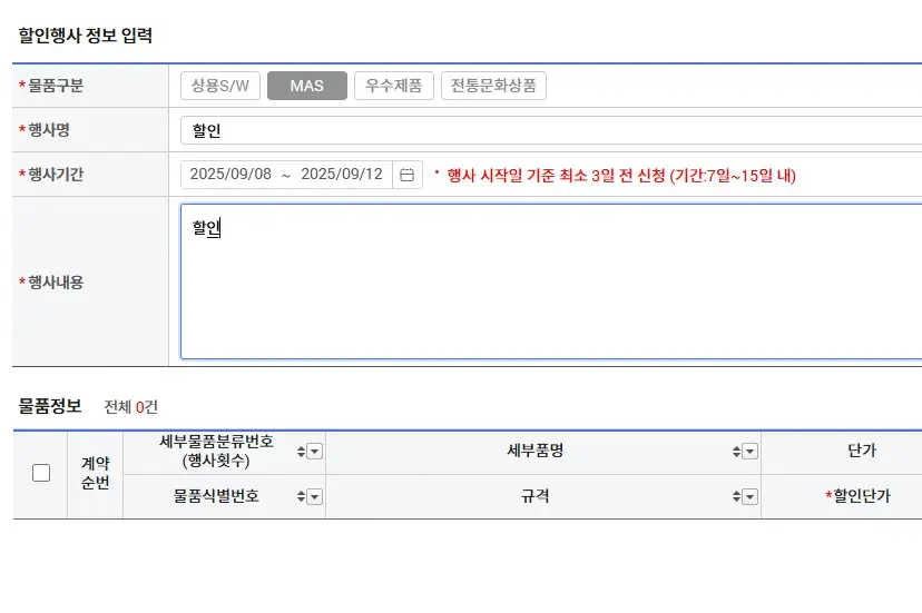 - MAS 계약된 수량내에서만 할인행사가 진행되기 때문에 더 많은 수량을 진행한다면 사전에 미리 변경계약을 통해 수량을 늘려두어야 합니다.