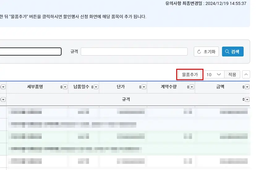 4. 계약된 MAS 세부품명이 노출되며 할인을 진행할 품명을 클릭합니다.
