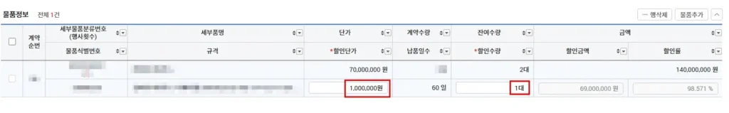 7. 추가 후 할인단가, 할인수량을 입력합니다 계약된 수량 범위내에서 할인수량을 지정할 수 있기때문에 계약수량보다 많은 수량을 할인 진행하고자 하면 변경계약을 통해서 수량을 먼저 늘려두어야 합니다.