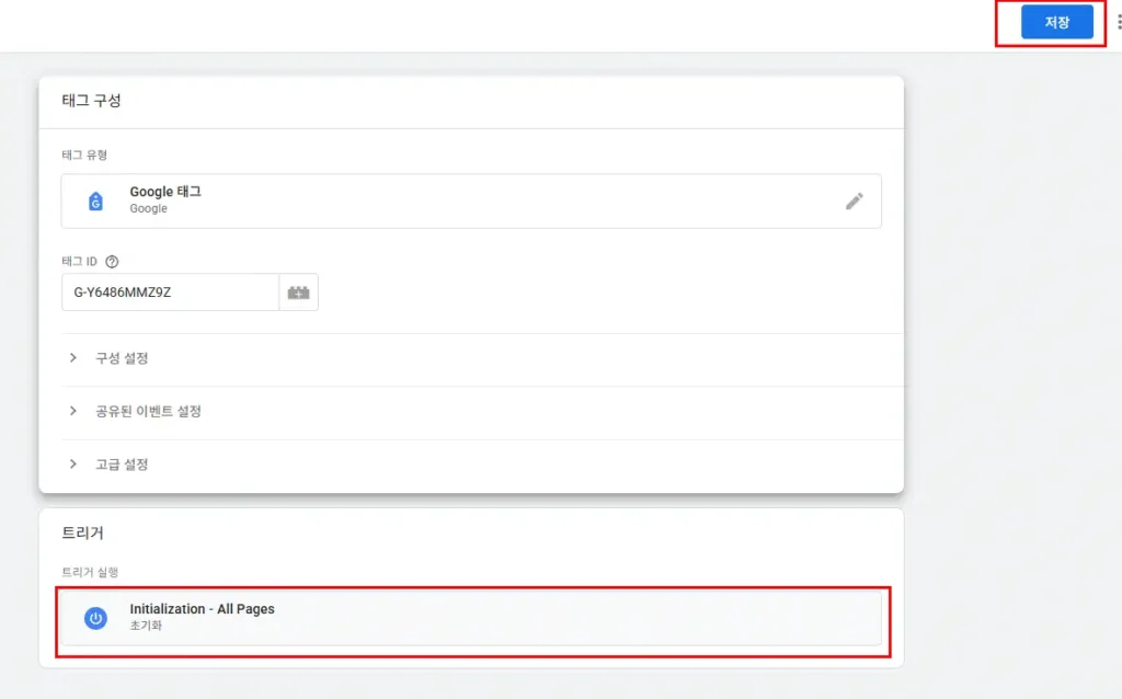 4. GA4 태그 측정 ID를 태그 ID에 삽입하고 트리거 동일한지 체크 후 저장