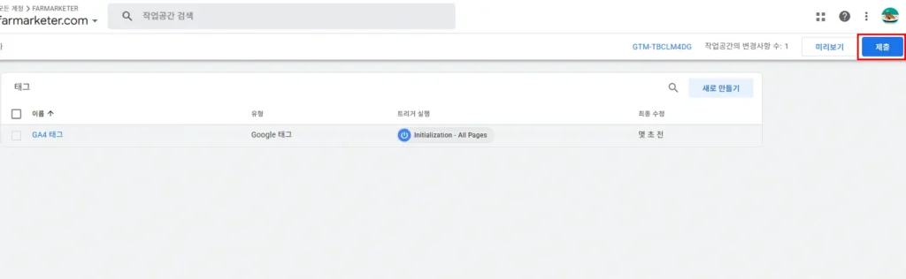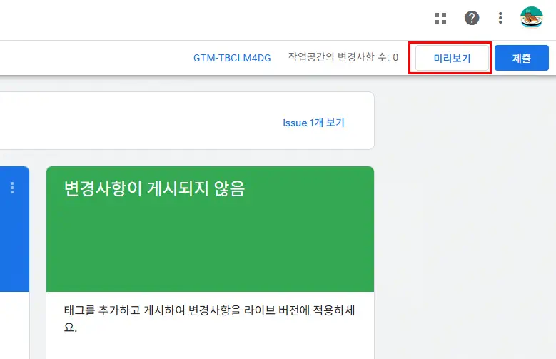 1. 설치가 완료되면 태그매니저 메인으로 돌아와 우측 상단에 미리보기를 클릭