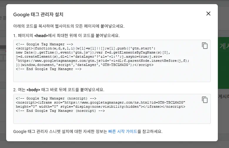계정 및 컨테이너 설정이 완료되면 나오는 코드를 head와 body에 설치합니다.