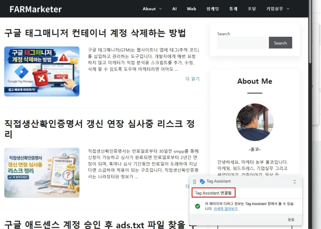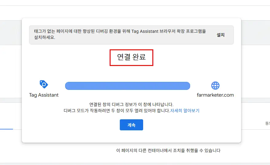 3. 연결확인, 여기까지 완료되셨다면 성공적으로 GTM을 설치하셨습니다.