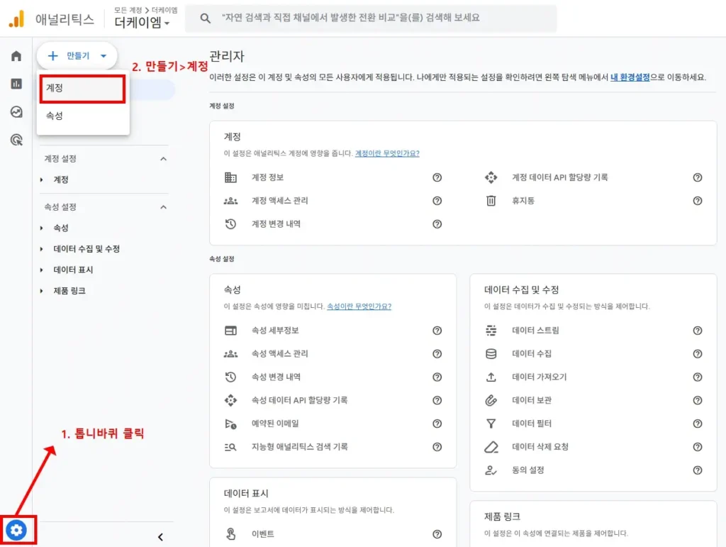 만약 추가로 애널리틱스 계정을 생성한다면 좌측 하단의 톱니바퀴 모양을 누르시고 만들기>계정 경로를 통해 생성할 수 있습니다.