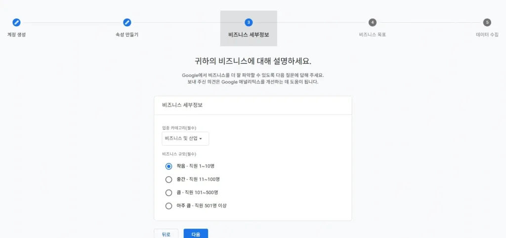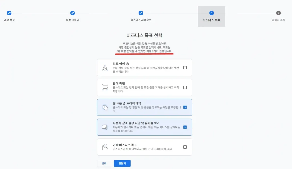 알맞는 정보를 선택해서 설정하고 비즈니스 목표의 경우에는 2개 이상 선택할 수 있지만 최대 2개가 권장되는 점 참고하세요.