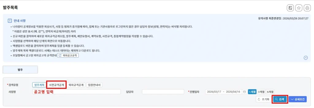 2. 사전규격공개 > 공고명 입력